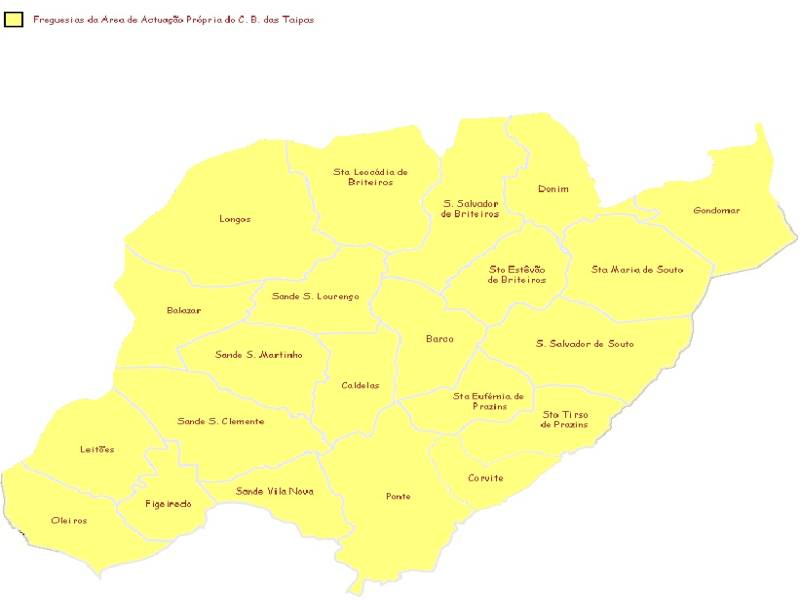 De acordo com o Decreto nº 38 439, de 27 de Setembro de 1951 e Decreto-Lei nº 10/85, de 31 de Outubro de 1985, da Inspecção Regional de Bombeiros do Norte aos Bombeiros Voluntários das Caldas das Taipas foi atribuída a seguinte área de actuação, dentro do concelho de Guimarães: