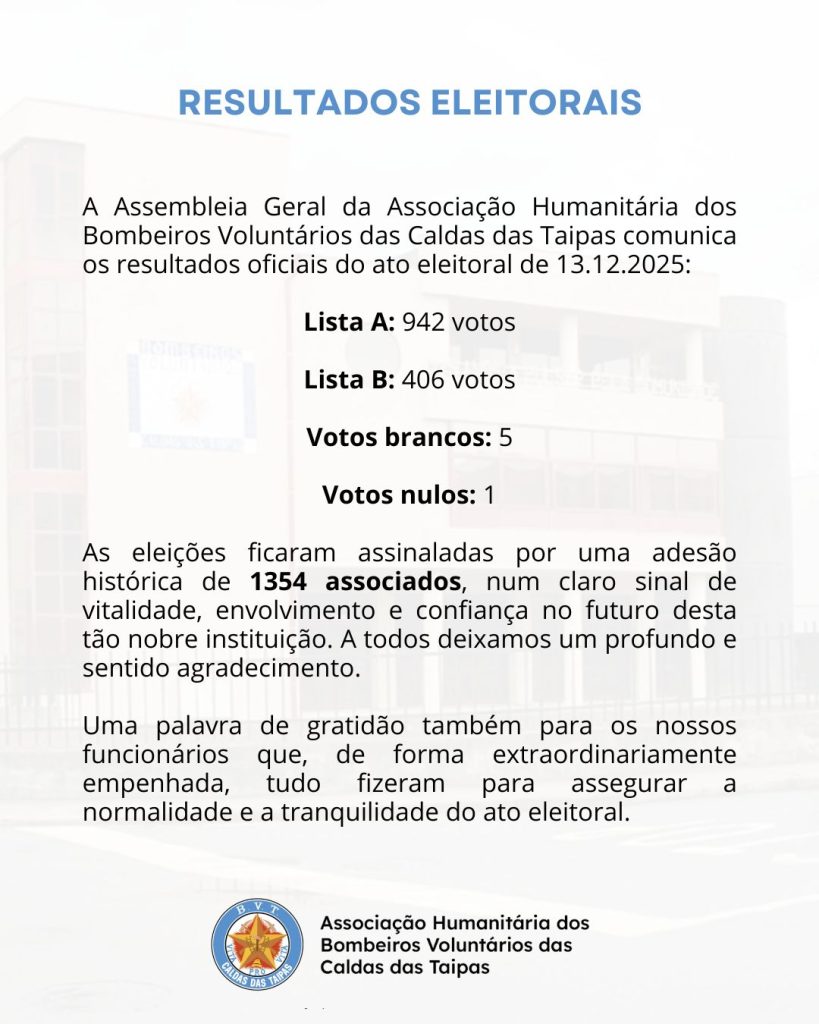 A Assembleia Geral da Associação Humanitária dos Bombeiros Voluntários das Caldas das Taipas comunica aos seus associados e ao público em geral os resultados oficiais do ato eleitoral realizado no dia 13 de dezembro de 2025.